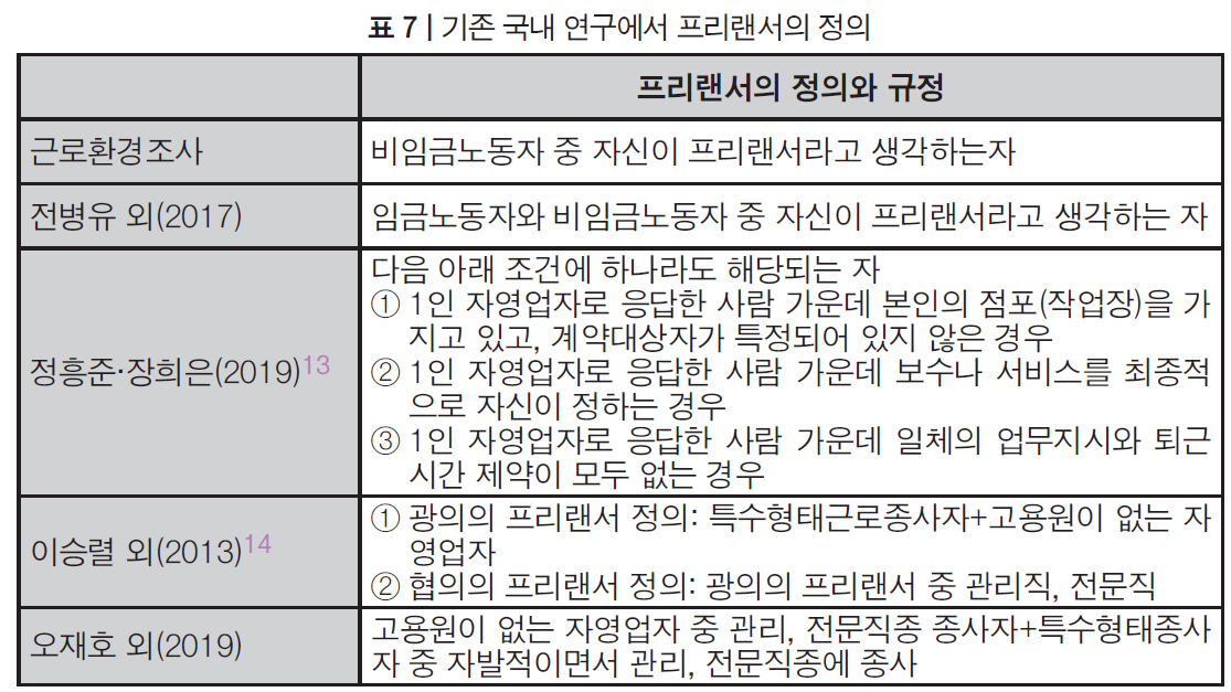 국내 선행연구에서 프리랜서 정의는 아래 표와 같이 다양한데, 크게는 임금 노동자 여부와, 노동자 본인의 자기 인식, 업무에 대한 자유도, 개인 점포 여부, 전문직/관리직 여부로 구분할 수 있다. 다만, 선행 연구의 프리랜서에 관한 정의는 실제 직업군과의 연결이 불분명해 그 범위의 경계를 짓기 어렵다는 한계가 있다.