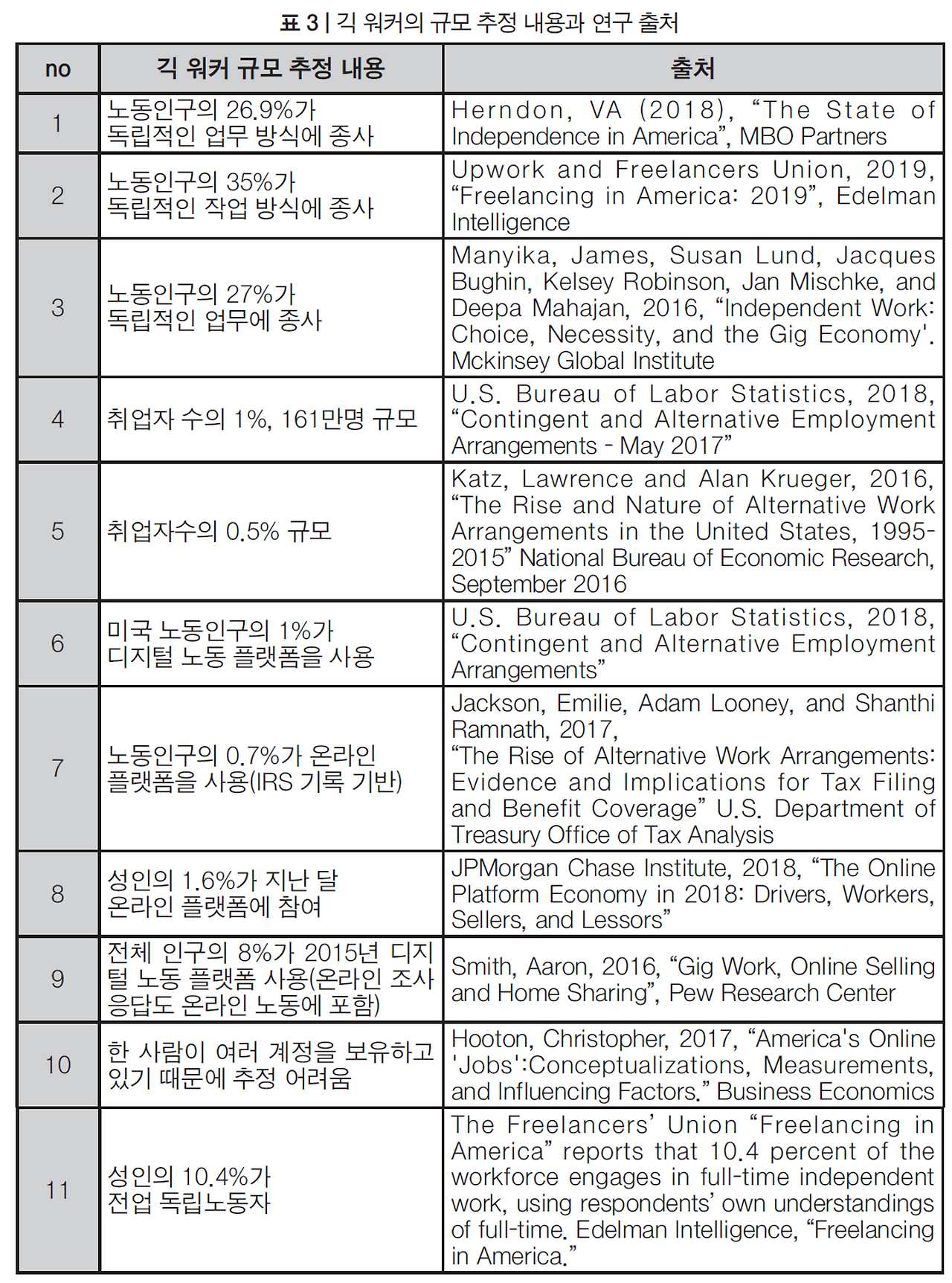 이러한 집계의 어려움 때문에, 노동 분야 최고 권위를 자랑하는 코넬 대학의 ILR School과 워싱턴 D.C. 소재의 Aspen Institute가 공동으로 구축한 긱 이코노미 데이터 허브 Gig Economy Data Hub는 다양한 방식의 추산을 통해 긱 워커 규모를 추산하는데, 이를 정리하면 다음과 같다.