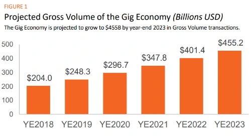 이 보고서는 디지털 노동 플랫폼이 글로벌 시장에 확산되면서 긱 워커가 2023년까지 전체 프리랜서 인구의 거의 10%까지 성장할 것으로 예상했다.