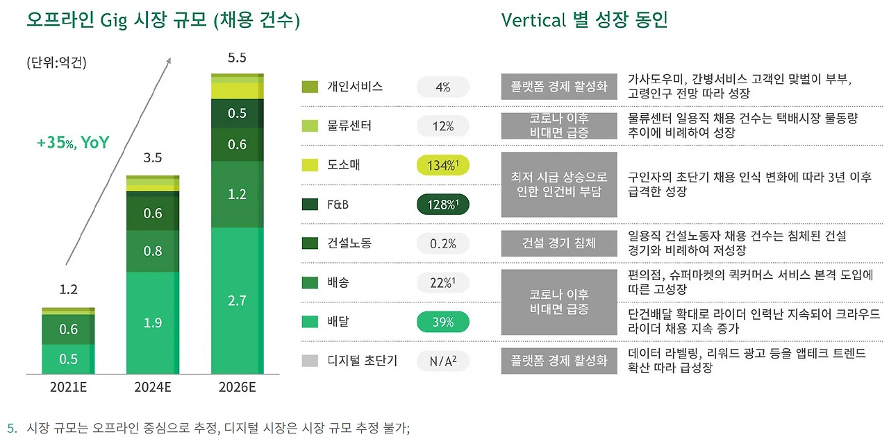 BCG 가 국내 업종 별 잡매칭 시장 규모의 성장추이를 분석한 결과, 오프라인 긱 시장의 채용 건수는 앞으로 5년간 매년 연평균 약 35% 증가, 26년까지 5.5억 건에 이를 것으로 예상된다.