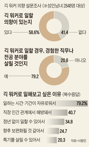 2022년 국내 구인구직 매칭 플랫폼 사람인이 수행한 설문조사 결과에 의하면 응답자 성인남녀 2,848 명 중 58.6%, 즉 10명 중 6명이 긱 워커가 될 의향이 있다고 답했다.긱 워커가 되고 싶은 이유는, 일하는 시간과 기간이 자유로워서 (79.2 %, 복수응답), 직장 인간관계에서 해방돼서 (40.7%), 정년 없이 일할 수 있어서(34.8%), 향후 보편화될 것 같아서 (24.7%), 특기를 살릴 수 있어서 (20.3%) 등이었다.