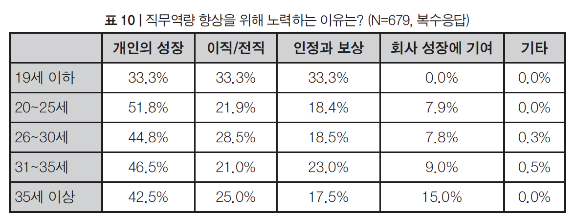 이 조사에서, 가장 입사하고 싶은 회사의 조건은 회사인지도와 높은 연봉이 언급되었다. 하지만, 그 중 성장을 중시하는 지원자들의 경우는 특히 연봉이나 워라밸 보다는 회사의 지명도나 배울 수 있는 사수나 멘토의 존재를 중시하는 특성을 보였다. 직무역량 향상을 위해 노력하는 이유로는 대부분의 연령대에서 나의 성장을 이유로 꼽았으며, 회사의 성장에 기여하기 위함이라고 응답한 응답자는 조사 대상 대부분 연령대에서 한자리 수 응답률에 그쳤다.