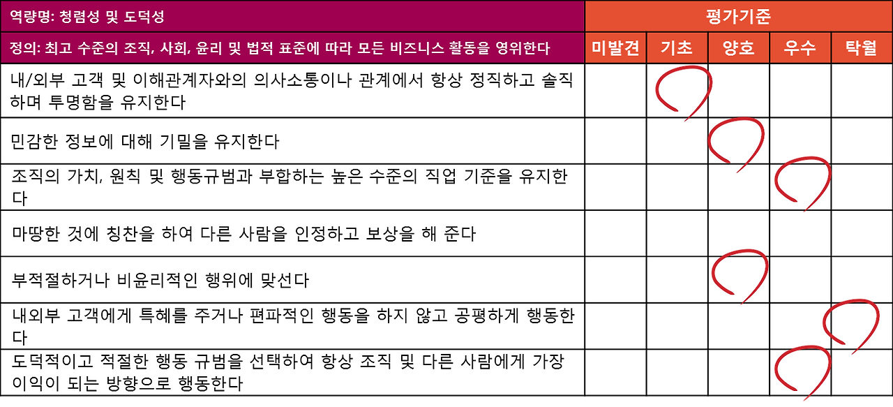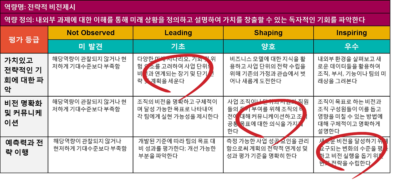 ex. 리더(임원급) 역량 - 전략적 비전 제시, 글로벌 관점, 매니저(중간관리자급) 역량 - 팀 구축 등