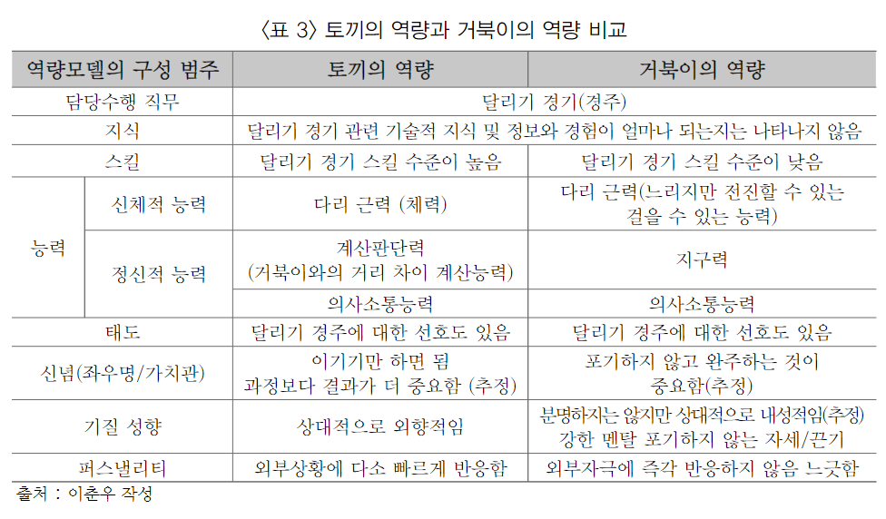아래의 표는 서울시립대학교 경영대학의 이춘우 교수의 2022년 논문에 실린 토끼와 거북이 우화를 통한 역량의 개념설명인데, 역량의 개념이 매우 쉽게 설명되어 있어 공유한다.