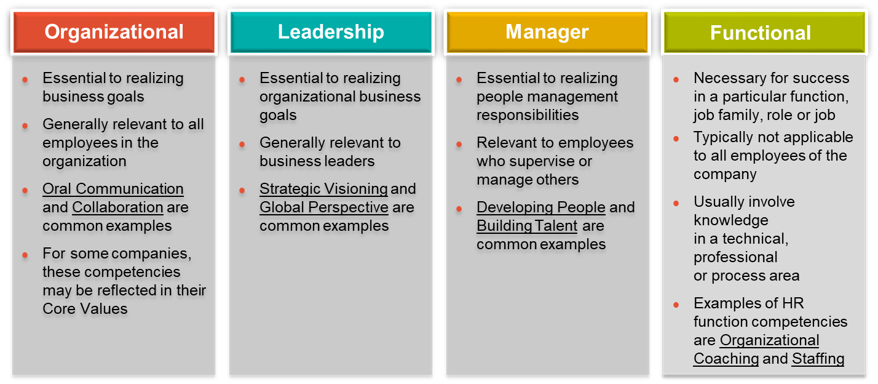 A competency refers to a cluster of knowledge, skills, abilities and other characteristics (KSAOs) needed for effective job performance.