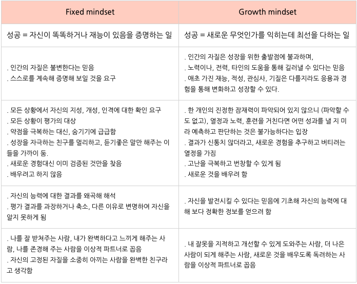 . 성장 마인드셋을 가진 이에게 실패는 고통스러운 경험일 수 있으나, 그 실패로 자신을 규정짓지 않음. 실패는 마주해 처리할 대상이고, 배움을 얻을 수 있는 계기로 여김