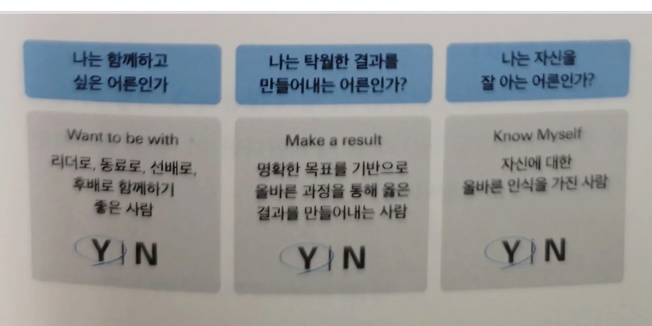 제가 정의하는 어른은 함께하고 싶은 사람, 탁월한 결과를 만드는 사람, 배울 게 많은 사람, 늘 겸손한 사람입니다. 우리가 어른다운지 확인하기 위해서는 다음의 세가지 질문에 Yes 라고 대답할 수 있어야 합니다.