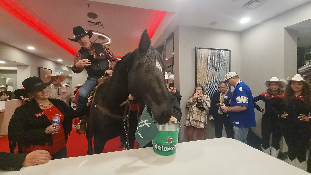 모두가 흥분과 긴장감 속에서 말을 기다렸다. 곧 전통 의상을 입은 행사 진행자들이 악기를 연주하기 시작하고, 카우걸 의상을 입은 마스코트들이 몸매를 뽐내며 한악진을 펼치듯 프론트 데스크 양 옆으로 나란히 섰다. 몰려온 사람들은 기대 속에서 맥주를 시켰고, 나는 음료를 서빙하면서도 말 손님의 등장을 놓칠까봐 노심초사했다.