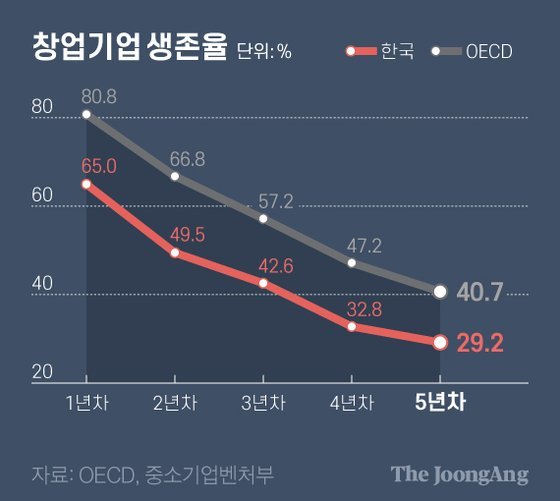 아래 그림처럼 통계가 말해주듯 창업기업의 생존율을 시간이 갈수록 떨어진다.
