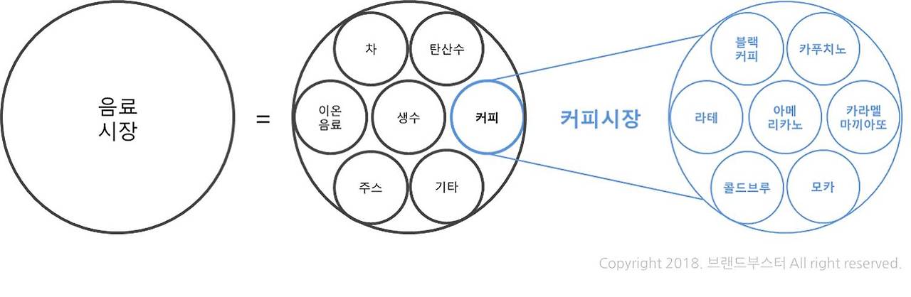 예를 들어 '음료'시장을 살펴보자. 갈증을 해소하고자 하는 니즈(needs)를 가진 모든 소비자는 이 음료시장의 구성원이 될 수 있다. 그런데 이 시장을 자세히 들여다보면 다양한 세부니즈가 존재한다. 그냥 생수를 마시는 사람도 있겠지만 이 밖에 커피나 이온음료, 주스를 원할 수도 있다. 또한 커피를 마시더라도 아메리카노, 콜드브루, 라테와 같이 취향이 갈라질 수 있다. 이와 같이 시장은 소비자의 니즈를 기준으로 생성되며, 기업 또한 이 니즈에 맞춰 제품이나 서비스를 생산하여 시장을 창출하거나 유지발전시킨다.