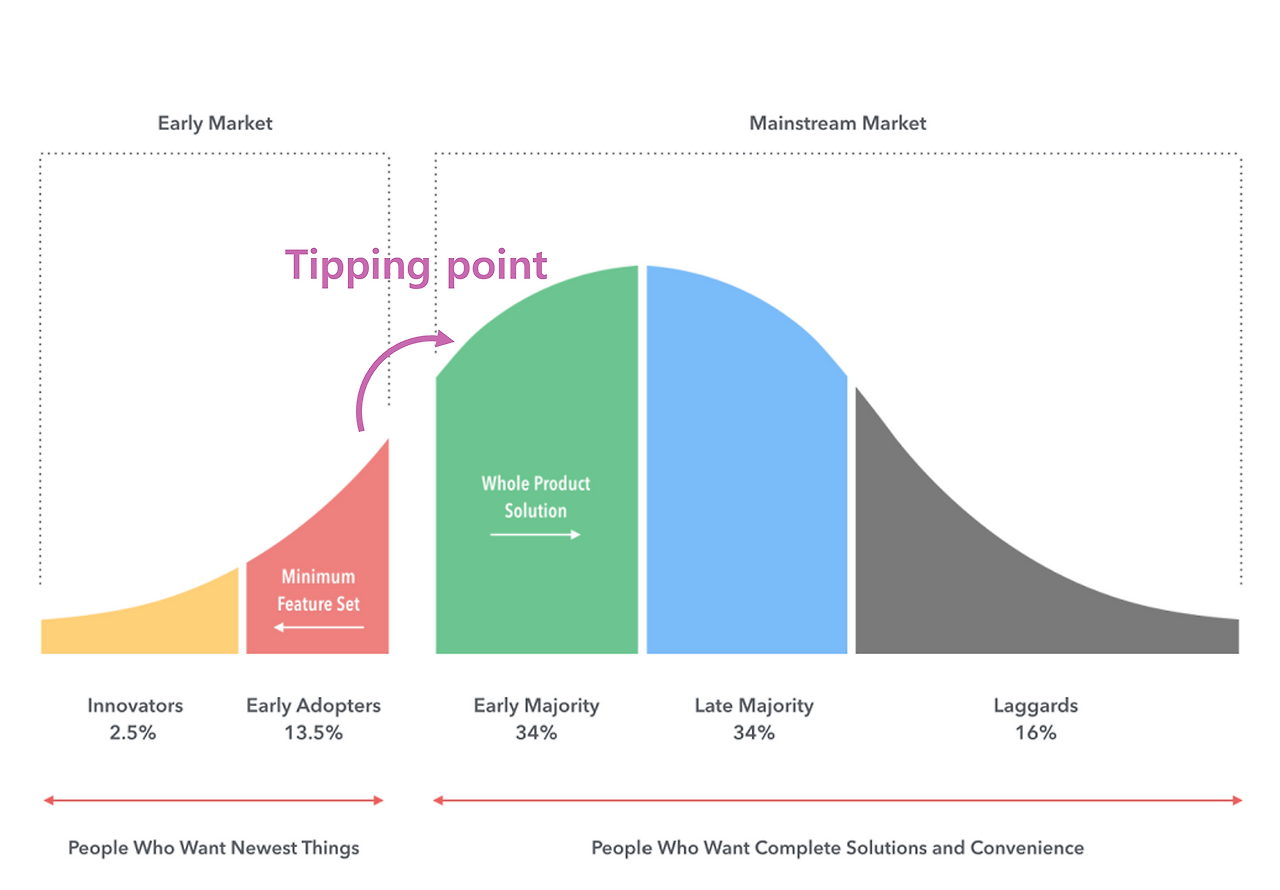 혁신수용모델과 연계하여 이해할 수 있는 다른 이론도 있다. 만약 당신이 혁신가부터 얼리 어답터까지 목표한 전체 시장의 16%(2.5%+13.5%)에 해당하는 혁신수용층을 확보했다면 주류 시장 68%(34%+34%)를 차지할 수 있는 준비를 마친 셈이다. 문제는 주류 시장에 큰 변화를 일으킬 수 있는 임계점이 필요하다는 점이다. 이 임계점을 티핑 포인트(Tipping point)라 한다. 어떤 혁신이 순식간에 주류 시장을 차지한다면 그 이면에는 계속 쌓아온 작은 변화가 존재한다는 사실을 알아야 한다.