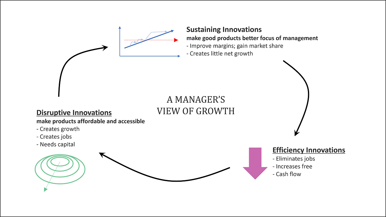 크리스텐슨 교수는 세 혁신을 선순환 관계로 만들라고 조언한다. 지속적 혁신과 효율적 혁신을 통해 확보한 현금을 다음 세대의 파괴적 혁신에 투자해야 다음 선순환을 만들 수 있기 때문이다. 불행하게도 최근 30년 동안 파괴적 혁신은 드물게 일어났다. 왜냐하면 대부분 단기간에 이익을 올릴 수 있는 효율적 혁신에 투자가 몰렸기 때문이다. 대표적인 예가 일본이다. 1980년대부터 일본의 도요타, 혼다, 소니와 같은 기업은 파괴적 혁신을 이룩했지만 1990년대의 일본은 닌텐도 Wii를 제외하고 어떠한 파괴적 혁신이 없이 효율적 혁신에만 투자했다. 그 결과 일본 경제의 성장은 정체되었다.