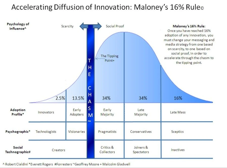 IT 비즈니스에서 혁신가와 얼리 어답터까지 확산되는 현상은 일시적 유행에 그치기도 한다. 전체의 34%에 해당하는 초기 다수자부터는 신중한 성격을 가지기에 생각보다 여기서부터 전파 속도가 느려지거나 아예 단절되는 경우도 있는데, 제프리 무어는 이 현상을 캐즘(Chasm)이라 불렀다.