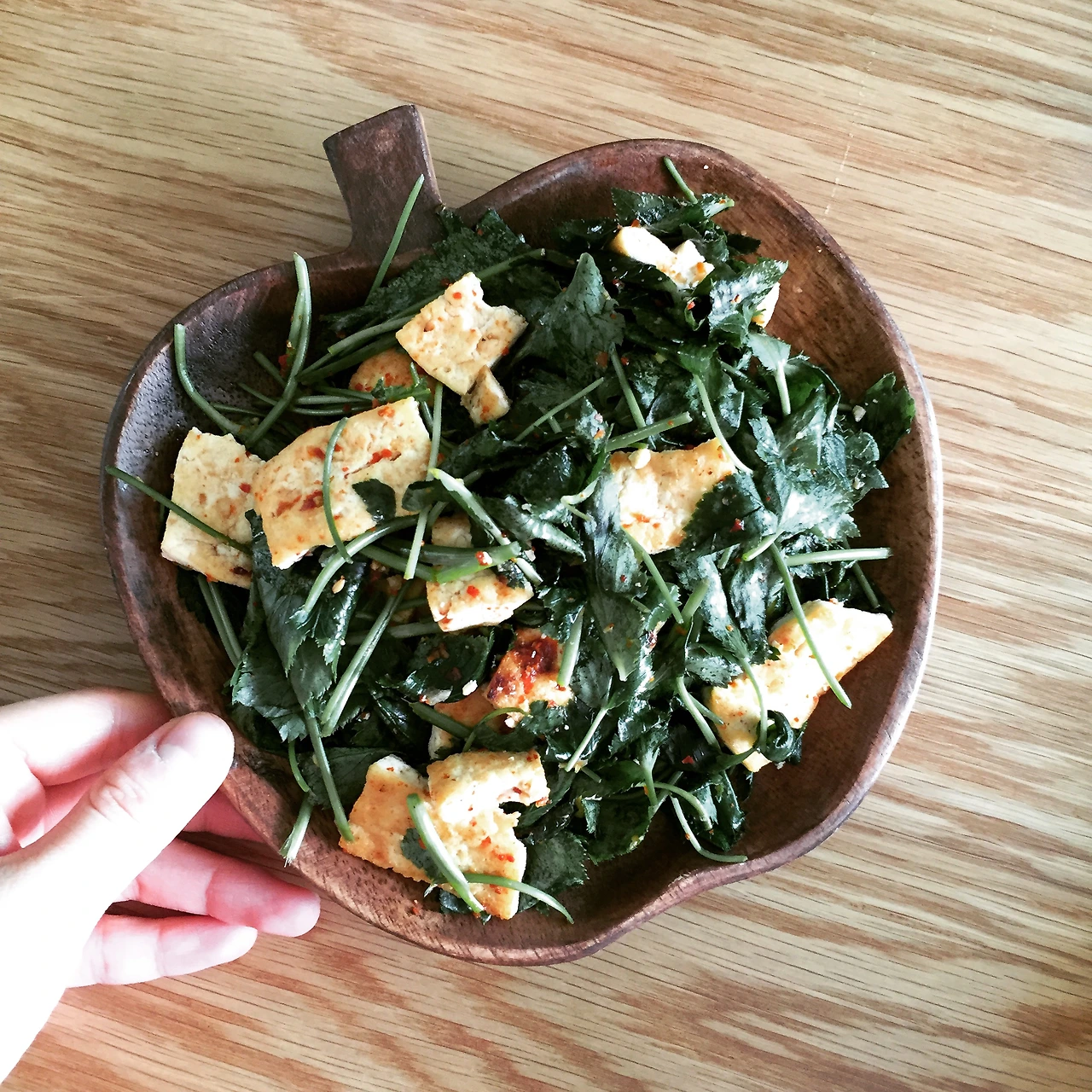 5. 참나물을 두부 위에 올리고 양념재료를 함께 살살 무쳐주세요.