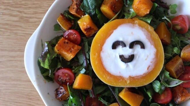 재미있는 모양의 땅콩호박을 굽고 삶아서 만든 따뜻한 샐러드입니다. 귀여운 땅콩호박의 단면에 스마일을 만들어 즐거운 브런치를 즐겨보세요.