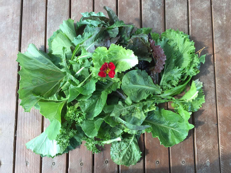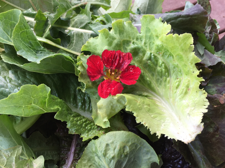 잎채소 위에 살포시 올려진 꽃은 한련화이다.