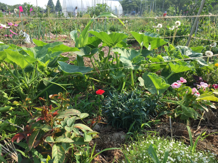 호박, 오이가 자라고 있는 곳 옆에 꽃들이 가득 있다.
