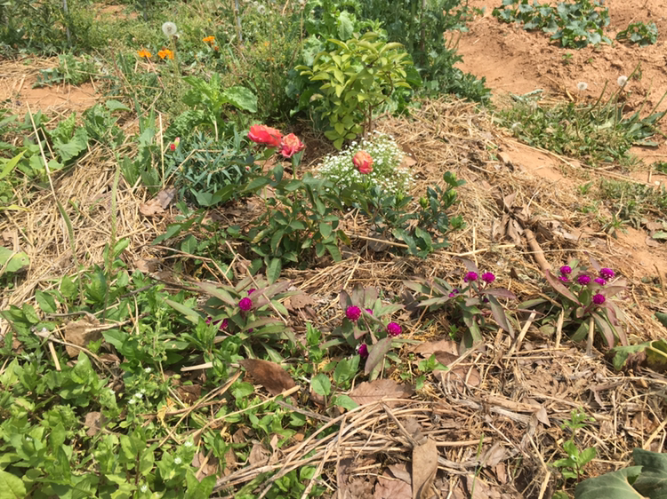 - 작물의 통풍을 방해하지 않는 선에서 작물 사이에 꽃을 심는 것도 좋은 방법이다. 꿀벌을 유도해서 열매를 잘 맺히게 할 수 있다. 마늘은 장미와 궁합이 좋다. 마늘밭 주위에 장미를 심어두는 것도 좋다. 텃밭이 삭막해 보이지 않는 효과도 있다. 특히 메리골드의 경우 해충을 방지해주는 효과가 있다고 한다. 그러나 내 텃밭에서는 메리골드가 잘 자라지 못해 아쉬웠다.