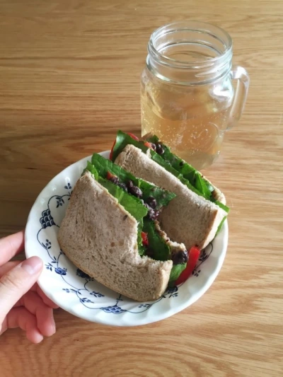 우리밀 현미식빵 2장, 낫또 한팩, 로메인 상추 4장, 파프리카 반쪽, 수제 토마토잼 살짝