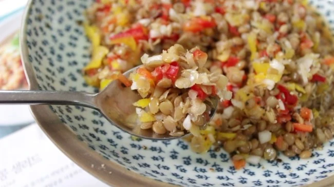 1. 렌틸콩은 끓는 물에 데쳐 물기를 빼둔다. (렌틸콩의 색이 노랗게 될 때까지 끓임)