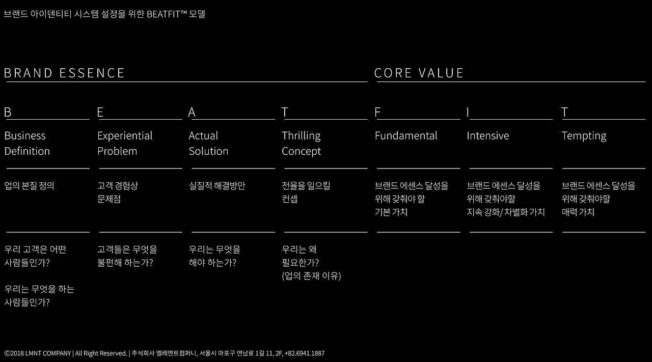 전략/ 기획. 크게 저희 회사에서 하는 브랜드 전략은 브랜드 가치 평가, 아이덴티티 전략, 포트폴리오 전략 등입니다. 아이덴티티 전략은 모든 회사가 하고 있는 일입니다. 쉽게 말하면, 지향가치를 추출하고 목표 이미지 체계를 수립하는 일이죠. 브랜드의 '좌우명' 같은 걸 만드는 일이라고 쉽게 생각하셔도 좋습니다. 저희는 'BEATFIT'(LMNT의 방법론)이라는 프로세스로 도출합니다. 그 프로세스로 훈련받고 몇 번 프로젝트를 하게 되면 혼자서 진행할 수 있도록 성장해 갈 수 있습니다.