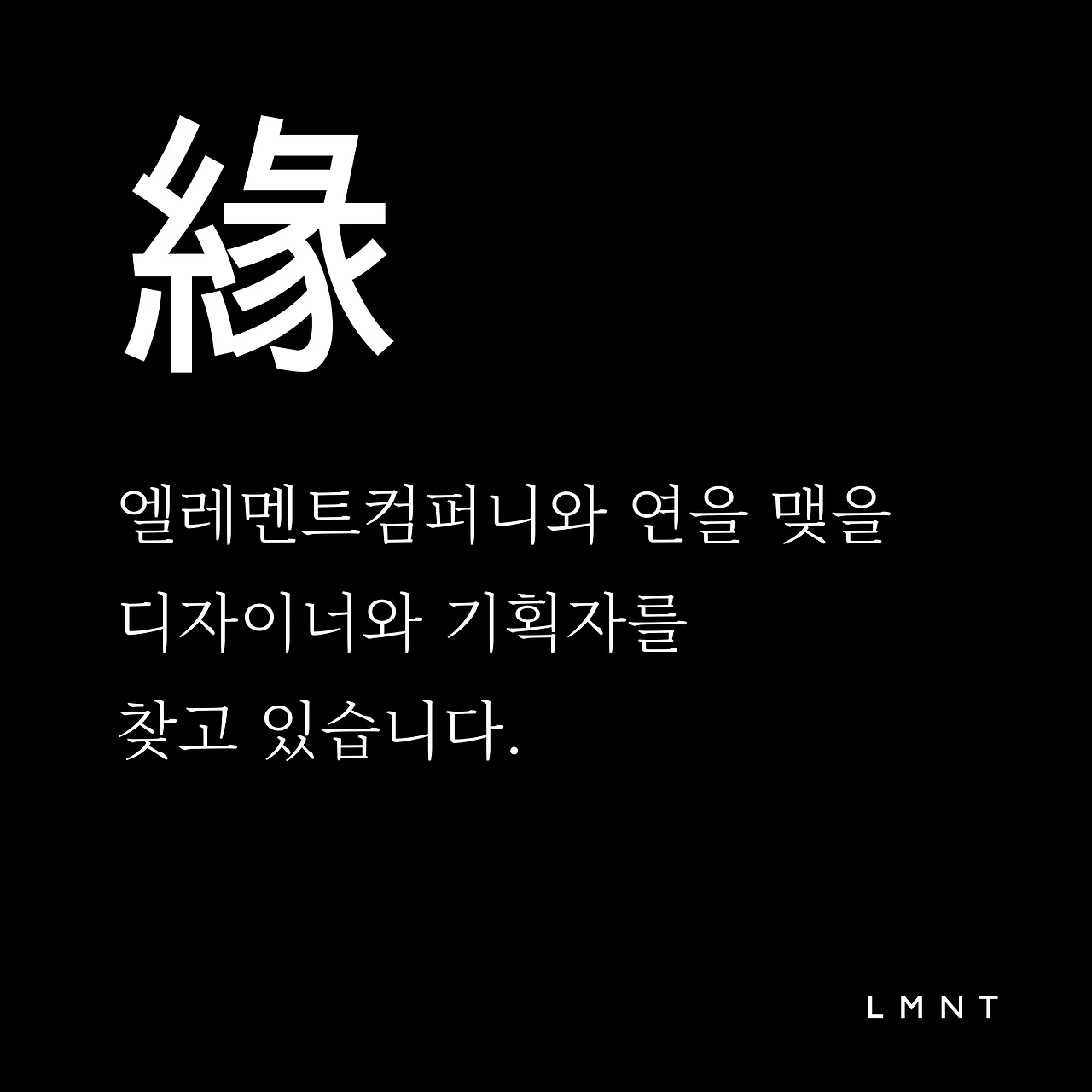 [2] 엘레멘트컴퍼니입니다. 마찬가지로 엘러먼트, 엘리먼트, 엘레멘츠, 엘리멘트 아닙니다. 회사 이름 잘못 쓰면 감점 대상입니다. 섬세하지 못하고 상대에 대한 배려가 없는 거거든요. 섬세한 사람들과 일하고 싶고, 섬세한 기업하고만 일하고 싶은 회사입니다.