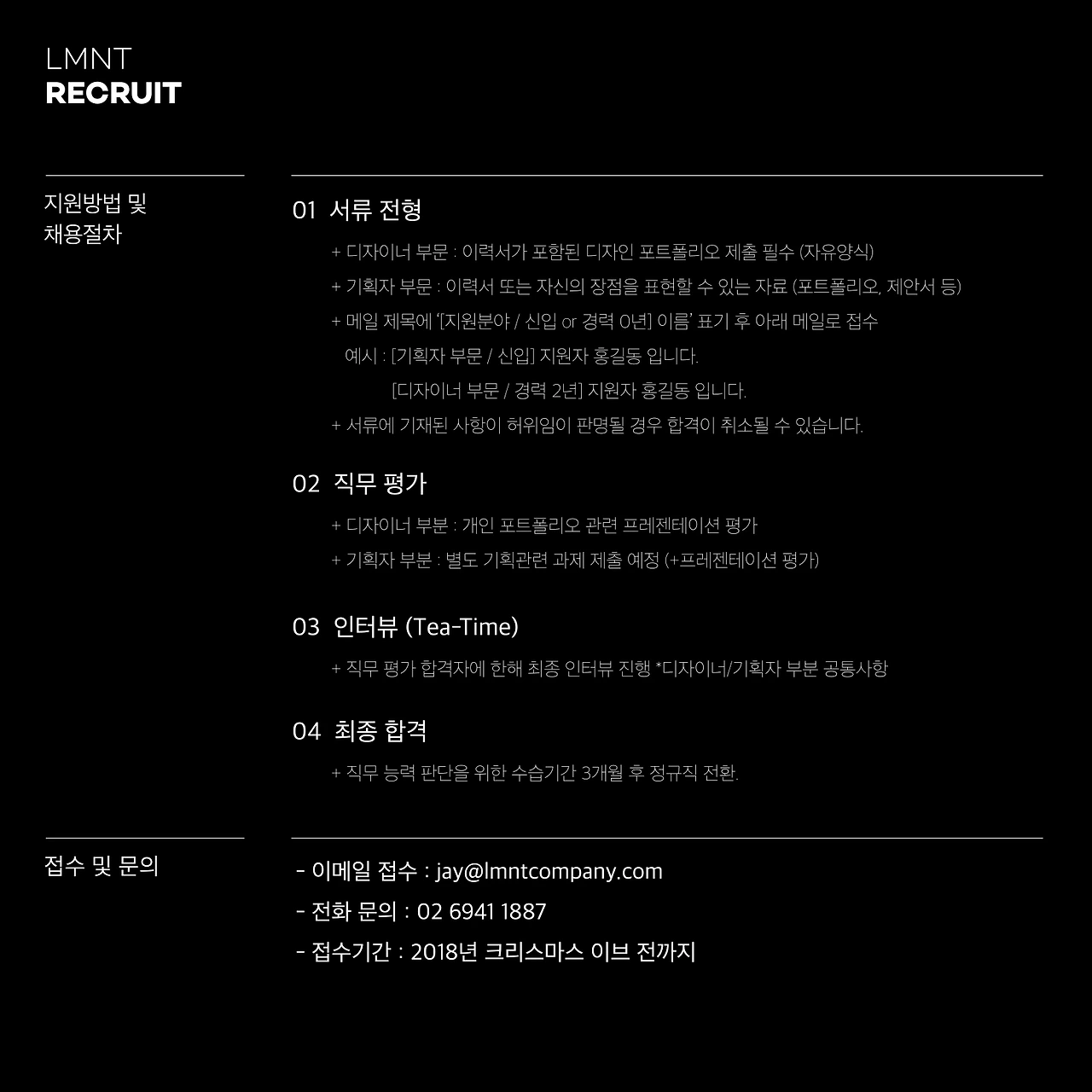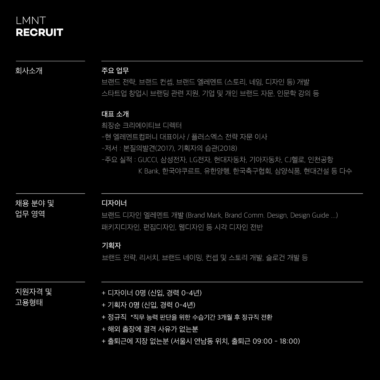 LMNT COMPANY(좌 클릭!!! 여기 들어가서 메일을 남겨주세요. 회사소개서 보내달라고 본인 이메일 남기면 부대표가 친히 보내드립니다. 회사소개서에 포트폴리오 일부 포함돼 있음. 메일 많이 남겨서 부대표 귀찮게 해주세요. )