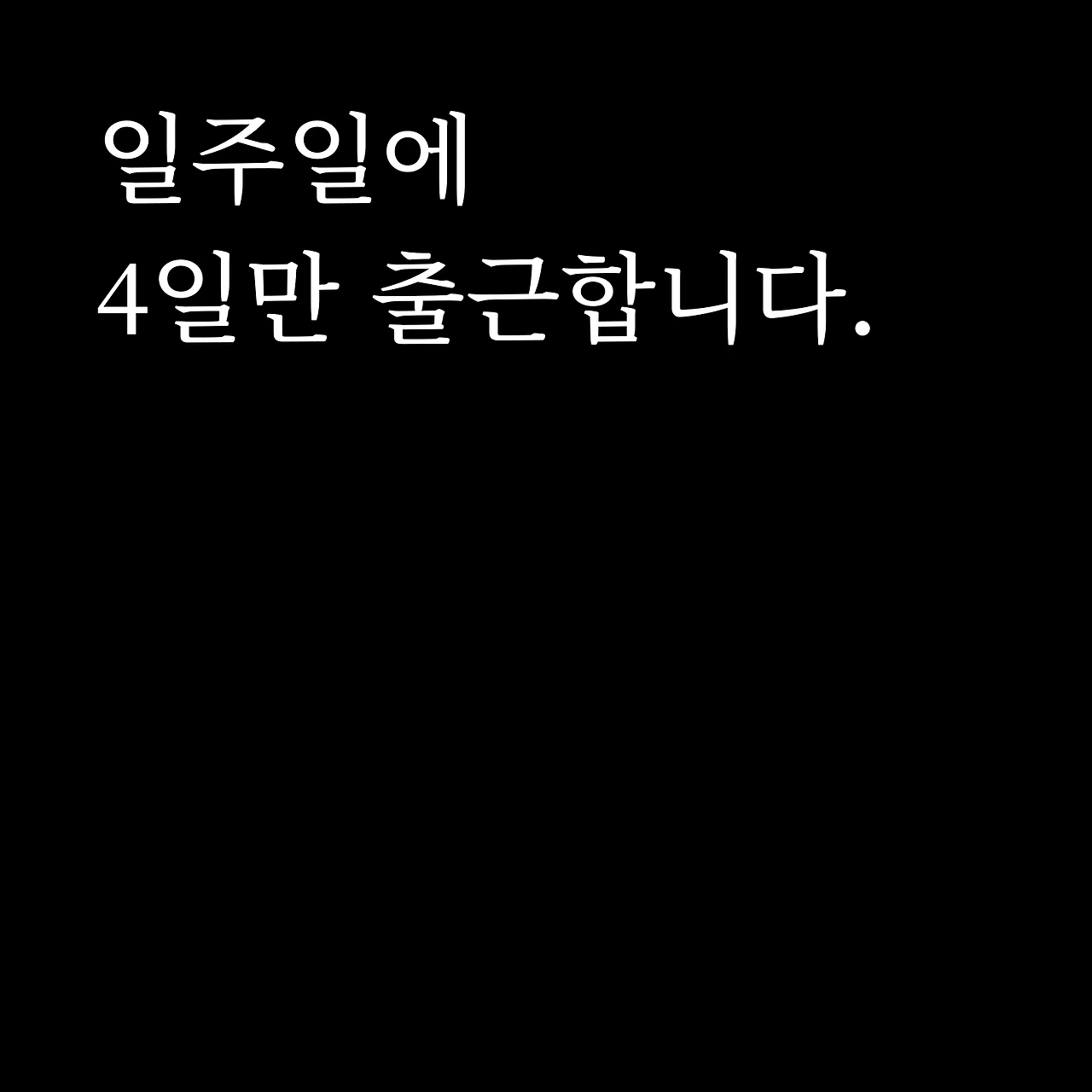 주 4일 근무합니다. 수습기간에는 5일 출근합니다. 물론 회사는 5일 운영됩니다. 서로 지혜롭게 날짜를 맞추어 한 달 주기로 쉬는 날을 정하면 됩니다.