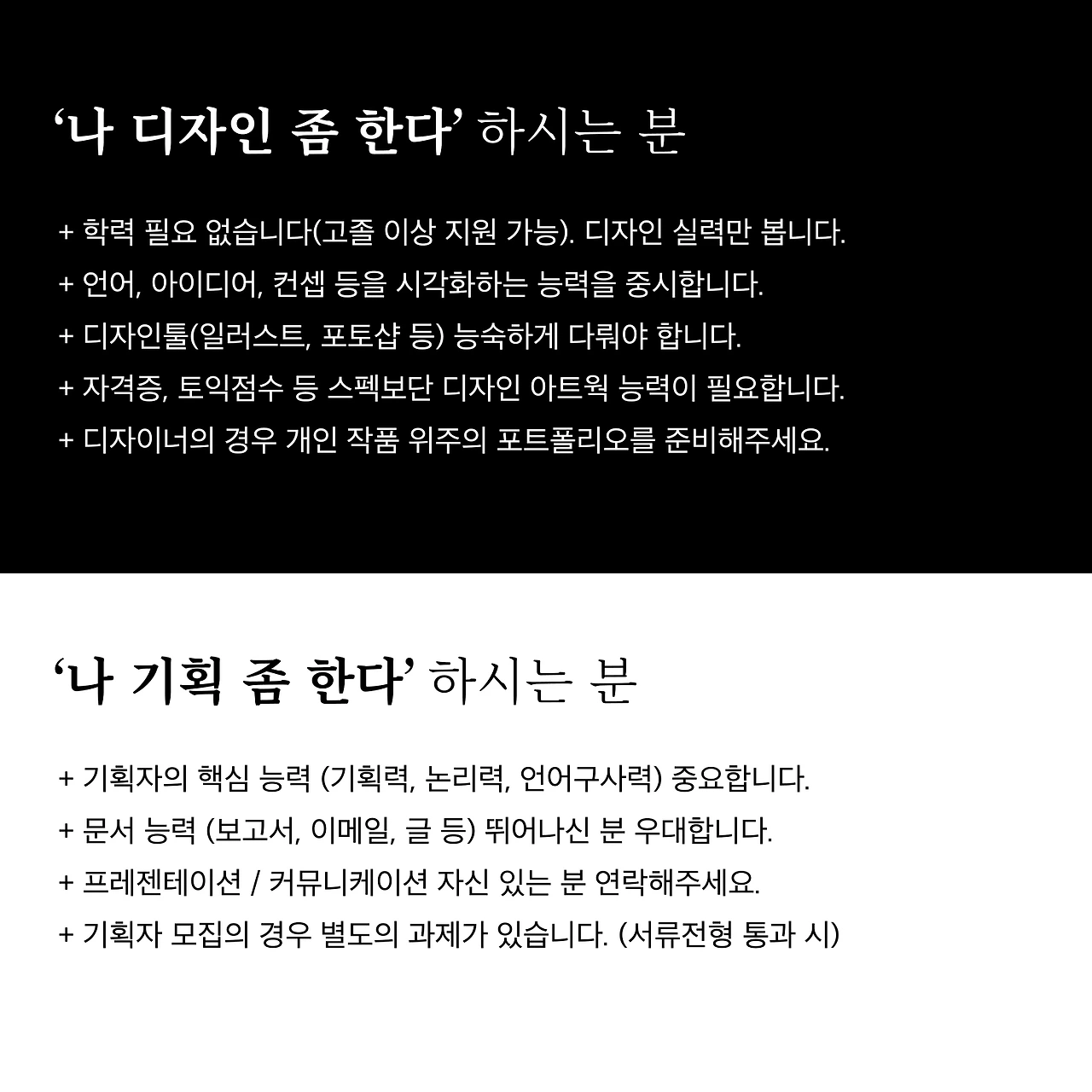 그건 정말 웃긴 일이잖아요? 대표자 취향에 맞는 인재상을 정해놓고, 그런 친구들만 모여 있으면 조직은 획일적 개성을 지닐 테니까요. 인재상은 없지만, 몇 가지 조건은 있습니다.