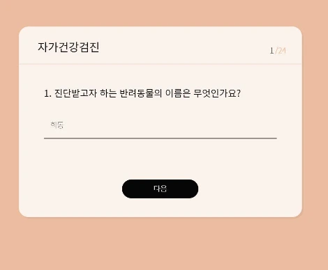 일상에서 자주 발생하는 강아지의 증상을 바탕으로 43가지 항목으로 답하고, 12가지 결과 지표로 건강을 체크할 수 있도록 만들었습니다.
