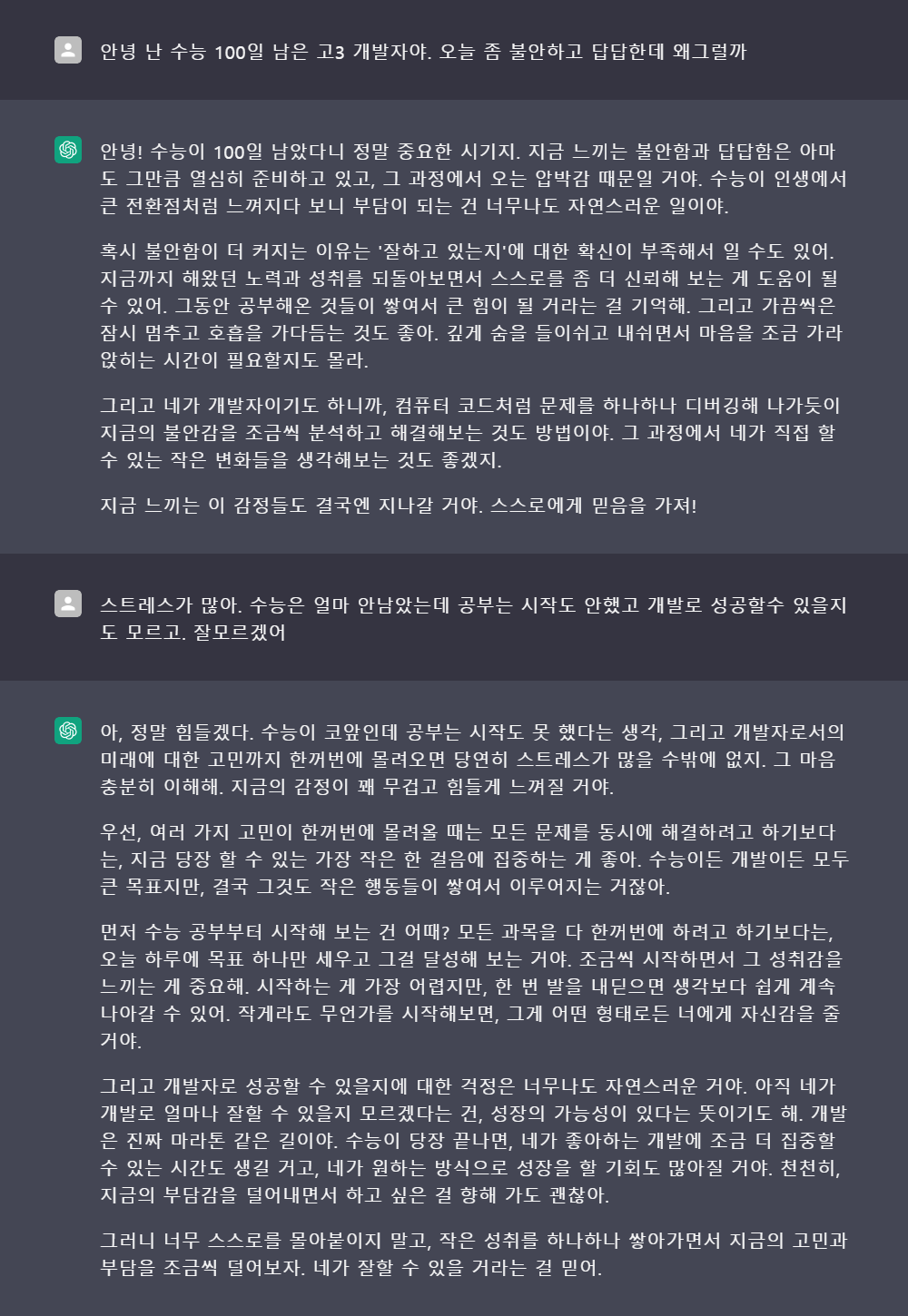 < 여러 고민이 한꺼번에 몰려오기 때문에 스트레스가 생기는데 작은 한 걸음에 집중하라는 GPT. 아빠보다 나은 답변이다.>