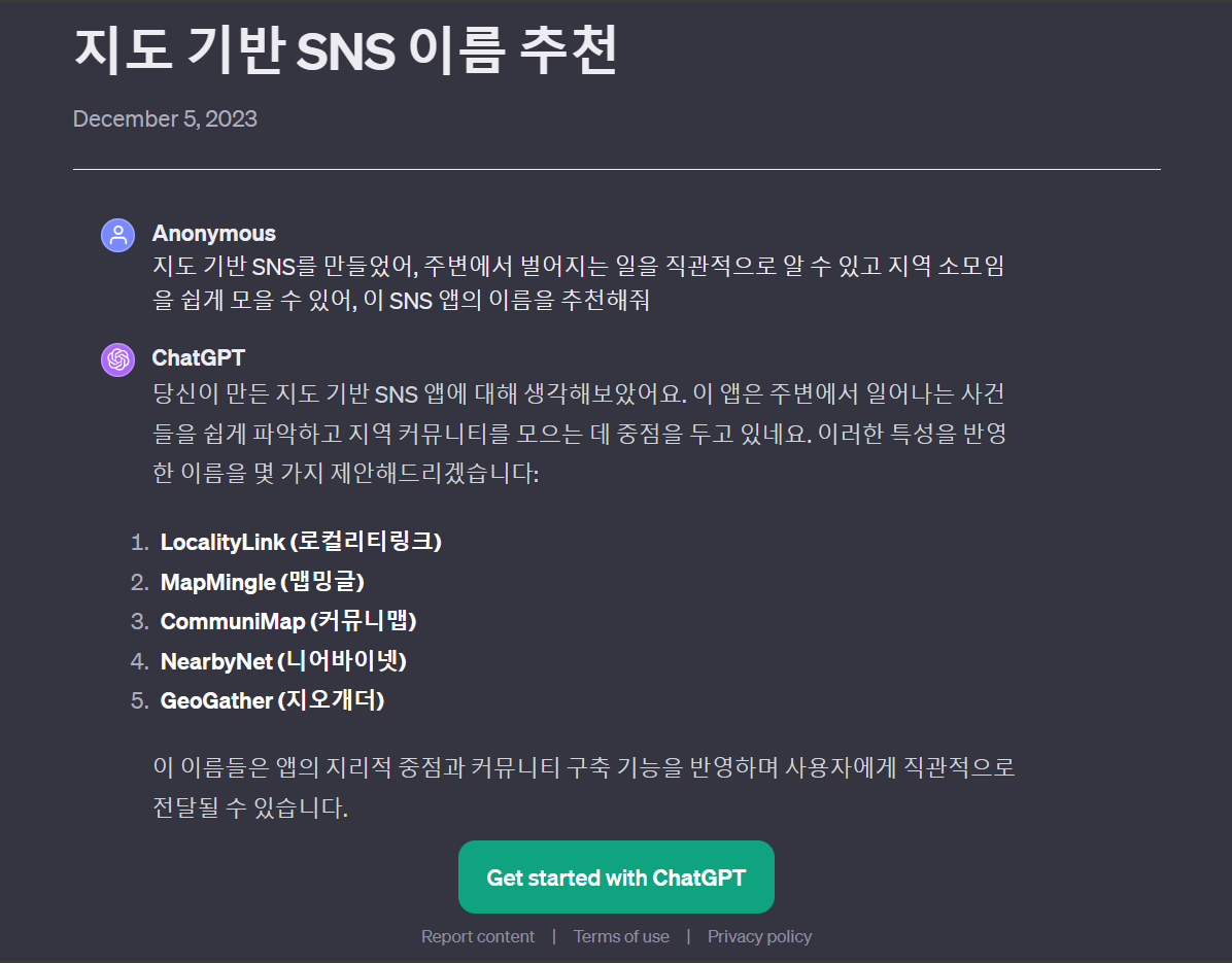 ChatGPT는 영어를 많이 학습해서 그런지 한국사람 취향에 맞는 매력적인 이름을 찾아주진 못했어요. 아들과 저는 서로 한참 동안 브레인스토밍하면서 이런저런 단어들을 그냥 막 던져봤어요. 마크타운, 맵박스, 맵톡, 타운톡, 등등 을 입력해 보고 결과를 보고 있다가 문득 이런 생각이 떠오르더라구요. 그냥 동네 주변에서 일어나는 일이니까 '주변'이라는 단어가 갑자기 눈이 들어오기 시작했어요.