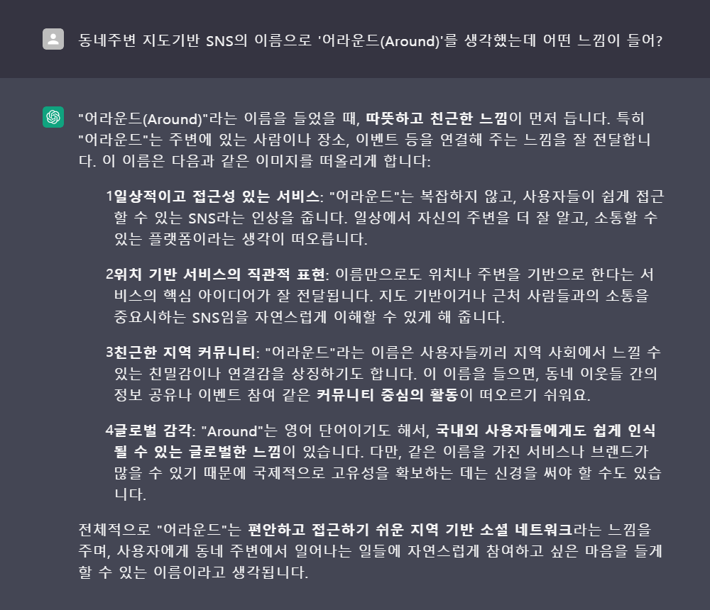 전반적으로 느낌이 좋다는 평가였어요. 부르기도 쉽고 우리의 '위치나 주변을 기반으로 한다'는 서비스의 핵심아이디어가 잘 전달된다는 점이 매력적으로 느껴졌습니다.