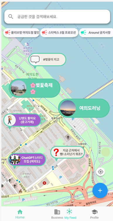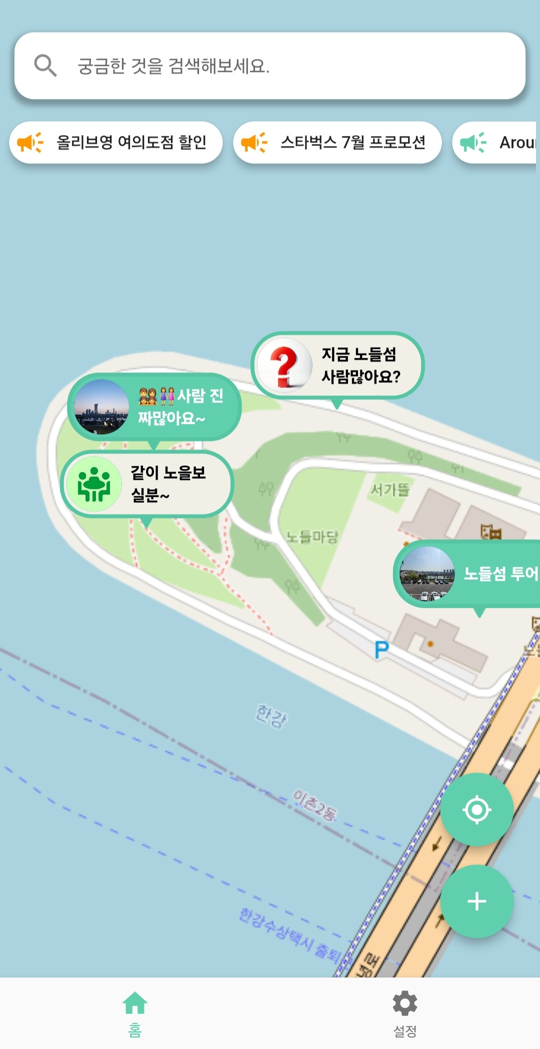 이때 어라운드가 있었으면 얼마나 좋았을까요? 노들섬 위로 지도를 옮겨 직접 질문을 올려 '지금 거기 사람 있나요?'라고 물어봤다면, 지금 노들섬에 나와 있는 사람들이 바로 답을 줬을 거라 생각했죠.