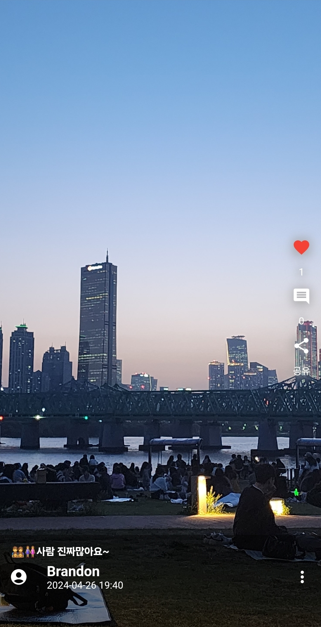 마침 일하던 사무실에서 노들섬 석양에 대한 이야기가 나왔어요. 4월의 봄바람이 살랑살랑 부는 날씨에 사람들이 엄청 모여서 해질녁 노을을 보는 명소라고 하더군요. 그래서 지금 그곳에 사람이 얼마나 있을지 궁금해서 유튜브와 CCTV를 검색해봤지만, 지금 이순간의 노들섬 현장 상황을 알수 있는 된 정보는 없었어요.