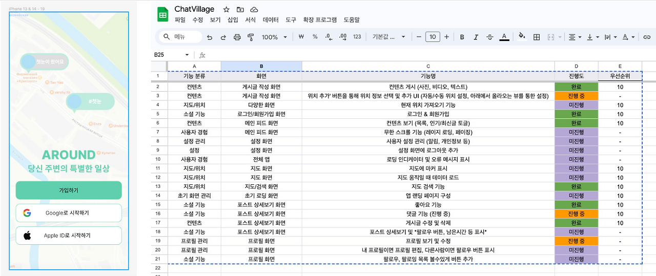 이틀 만에 승우님이 어라운드 앱의 상세 페이지 초안과 각 기능을 엑셀로 꼼꼼히 정리해 보내주셨습니다.