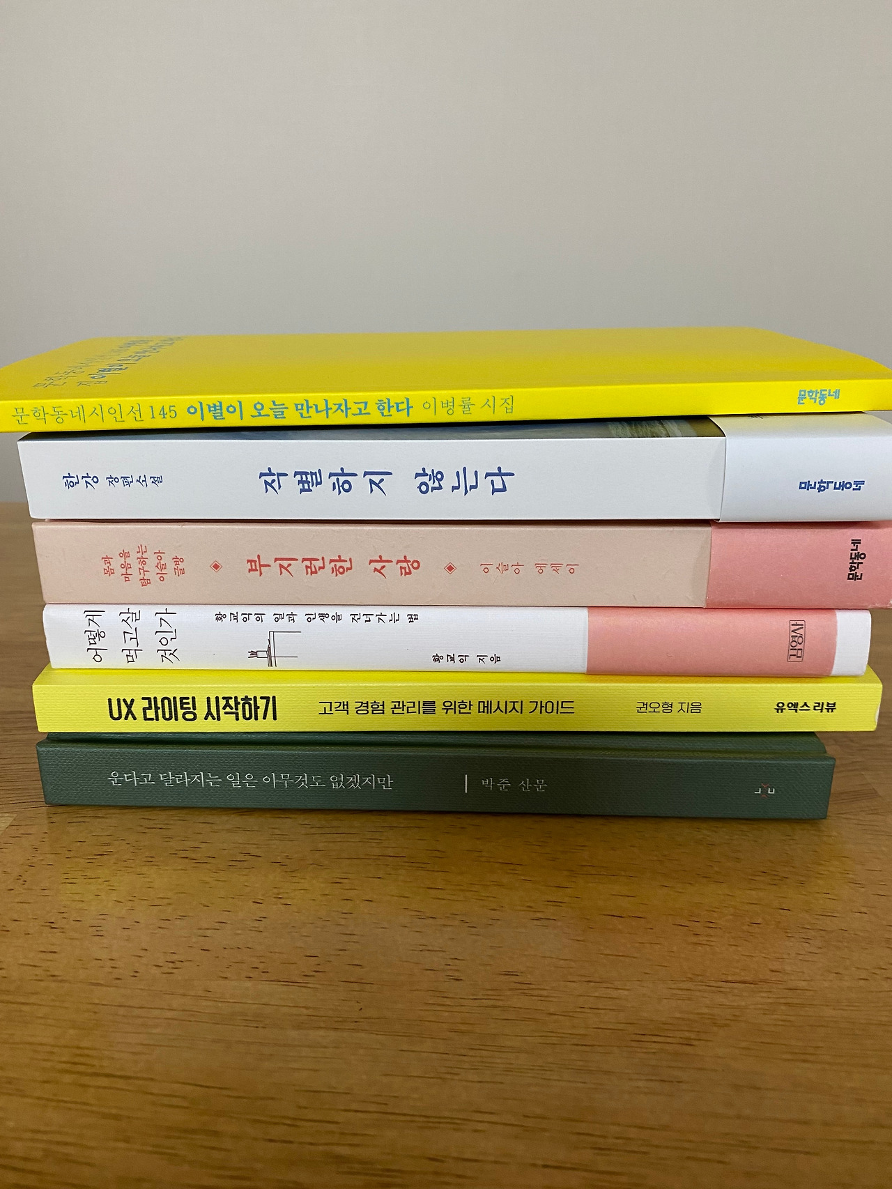 두 개 층으로 구성된 서가를 오르내리며 변함없이 나의 '구매 목록 구성 기준'에 따라, 소설가 한강의 신작 <작별하지 않는다> 시인 박준의 산문집 <운다고 달라지는 일은 아무것도 없겠지만> 이슬아 작가의 에세이 <부지런한 사랑> 맛 칼럼니스트 황교익의 책 <어떻게 먹고살 것인가> 이병률의 시집 <이별이 오늘 만나자고 한다> 유엑스리뷰에서 출간한 <UX라이팅 시작하기>를 바구니에 담았다.
