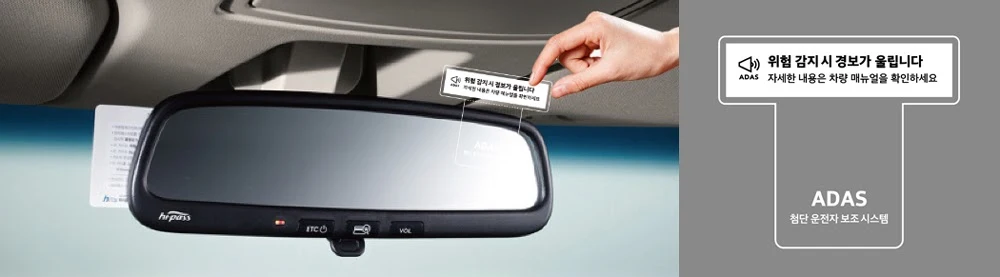 ADAS(첨단 운전자 보조 시스템) 안내문. 위험 감지 시 울리는 경보에 운전자가 놀라지 않도록 차량 내 스티커를 통해 미리 안내한다. 운전자의 시야에 쉽게 닿으면서 운전 시 거슬리지 않을 위치(룸미러 영역)를 찾아 안내문을 부착했다.