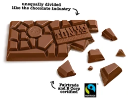 그 이유는 초콜릿 업계가 불평등하게 분열되어 있음에도 초콜릿이 동일한 조각으로 나누어져 있는 것이 마음에 들지 않았기 때문에 그 불평등함을 상징하듯 고르지 않은 조각들로 나누어져 있는 것입니다.