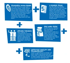 : 최소 5년간의 장기 계약을 맺어 협력적인 관계가 지속 성장할 수 있도록 합니다. 새로운 코코아 식물이나 농업장비를 구입하고 교육을 하는 등 지역사회 지원을 통해 협력적인 관계를 형성하며, 나아가 불법아동노동이나 현대판 노예제도 근절에 대한 인식을 심어줍니다.