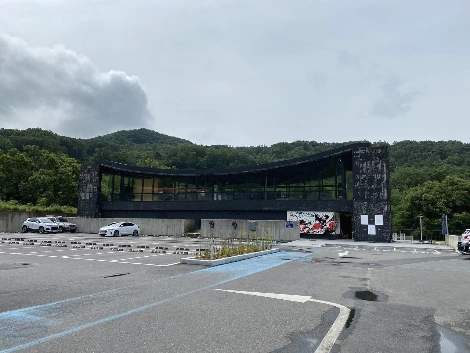 사진에서 보듯이 넓은 주차장 너머 초록산 배경 앞에