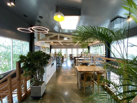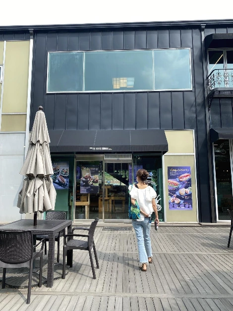 초록 잔디와 초록나무에 둘러싸인 카페 건물이 매력적이었으며