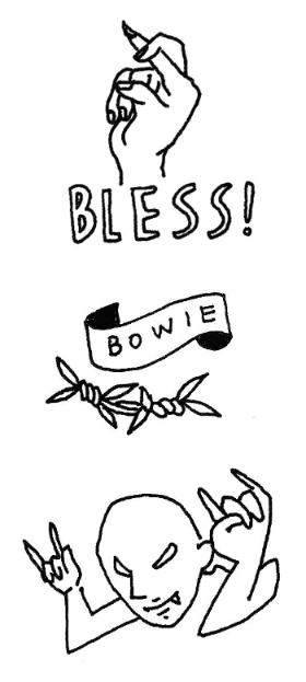 가장 눈에 띄는 것은 BLESS라는 문구와 손가락을 꼰 손 모양의 타투입니다.