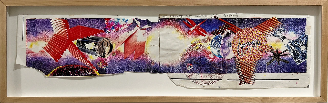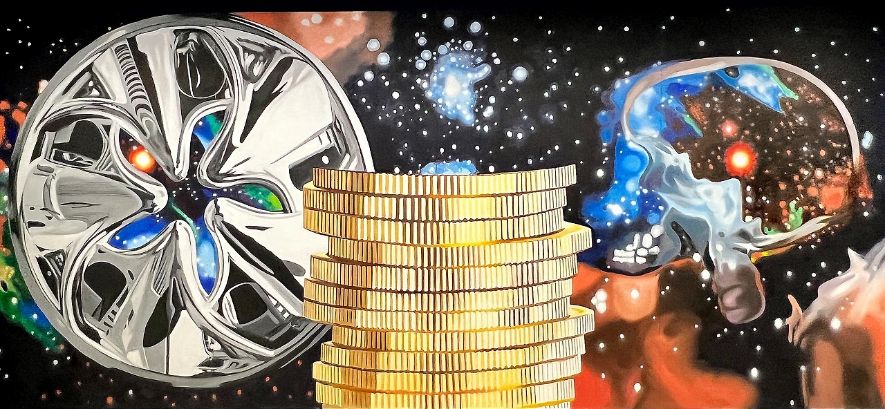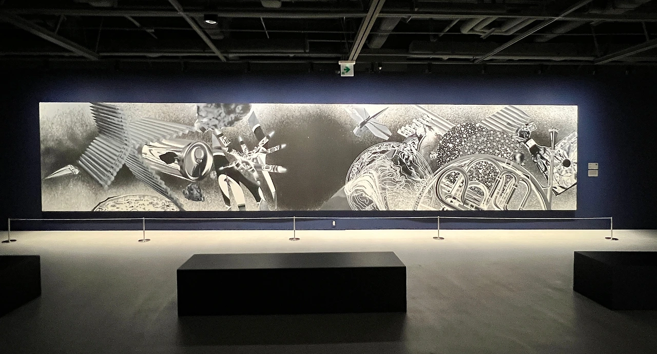 가로 10미터가 넘는 대형 작품인 <시간 먼지-블랙홀〉은 '블랙홀' 같은 화면 중앙의 좌우로 익숙한 사물을 구성해 생경한 조합을 꿰어냅니다. 왼쪽부터 은하계를 떠다니는 배, 교차하는 연필 다발, 음료 캔, 화염처럼 회전하는 둘둘 말린 100달러짜리 지폐가 우주선처럼 떠다니며, 오른쪽에는 종이 잠자리에 이어 원형과 구불구불한 곡선으로 이루어진 'IN GOD WE TRUST(우리가 믿는 신 안에서)'가 적힌 1 페니 동전, 호른, 색맹 검사법 모티프가 포착된다. 거대한 스케일로 과장되게 표현된 이미지의 조합은 우주 경쟁에서 우위를 점하려는 욕망과 그로 인해 파생되는 역사와 잇따르는 파괴적 상황 등 미국의 시대적 배경에 관한 작가의 비판적 인식을 포괄합니다.