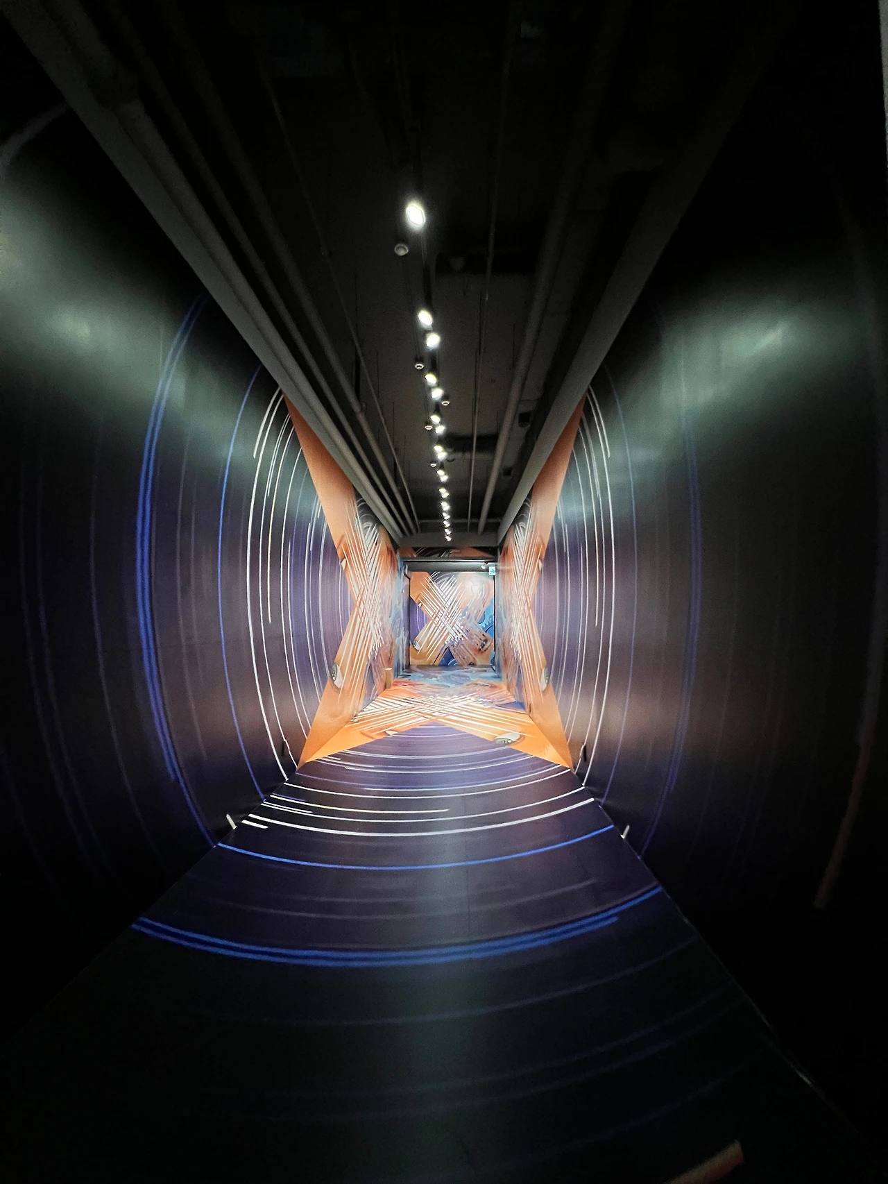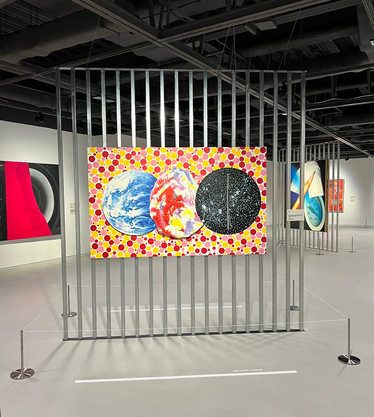 화면 상단에 등장하는 비정형적인 곡선의 교차는 빛이 굴절되는 것처럼 시간도 곡선으로 흐른다고 주장한 알버트 아인슈타인의 상대성 이론을 떠올리게 합니다. 상대성 이론에 관심을 두었던 작가의 관심은 우주 차원으로 그 경계를 넘나듭니다.