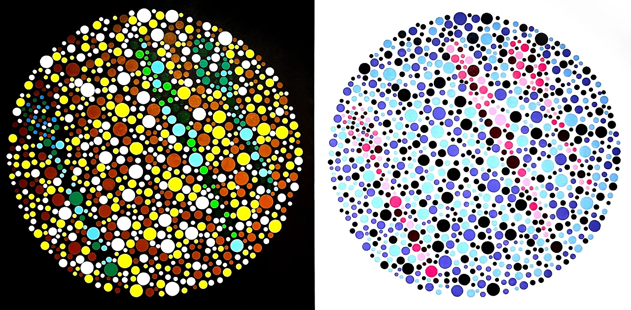 1991년 작품인 <일식>, <오늘의 메뉴/ 디너 스페셜>, <시점(개미가 소행성을 상속받다)>에는 색맹 테스트를 떠올리는 이미지가 반복적으로 등장합니다.