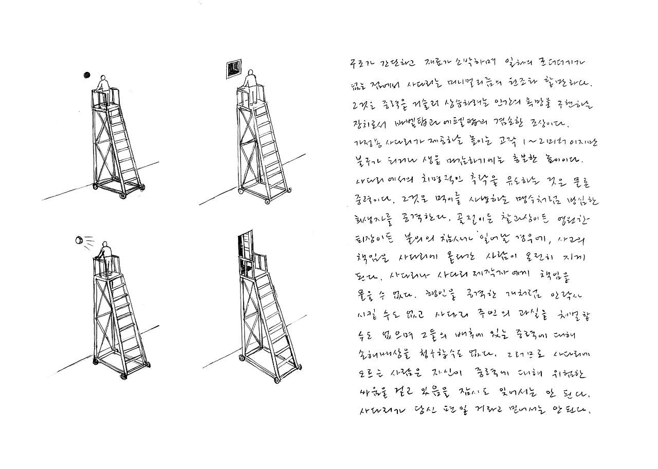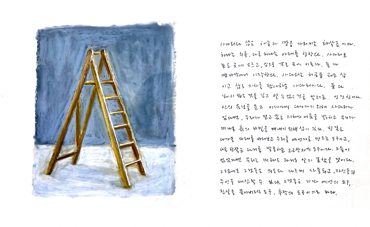 안규철 작가는 일상적인 사물을 소재로 우리 삶의 태도와 예술의 역할을 질문한다. 그 방법으로 연필, 의자, 탁자, 벽돌 등 보편적인 사물에서 아이디어를 얻고 그것으로 파생되는 사유의 결과를 드로잉과 텍스트 그리고 설치 및 참여형 작품으로 구현한다. 이번 전시에서는 '삽'과 '사다리'가 주인공이 되었다. 고소작업에 주로 쓰이는 사다리와 땅을 파는데 쓰는 삽은 인간의 활동영역의 양극단에 있는 노동자의 상징이다. 전시장에는 사물의 정의부터 제작과정, 재료, 사용방법과 관리방법, 부작용에 대한 경고까지 사물에 대한 특성이 서술된다. 이어서 사물의 일반적인 용도 뒤에 숨겨진 의미와 우리 삶 속 진실까지 더듬어 나간다. 작가는 사다리와 삽을 각각 하늘과 땅을 가리키는 화살표로 보았다. 사다리는 높은 곳에서 다가올 미래를 바라보는 도구, 삽은 우리가 잊고 있는 과거를 발굴해내는 도구인 것이다. 이처럼 상식 뒤에 가려진 사물의 참모습을 추적하여 평범함 속에 숨은 비범함을 찾아내듯 예술의 본질, 예술가의 본질을 생각하게 한다. 그리고 우리 삶의 본질을 깨닫도록 한다.
