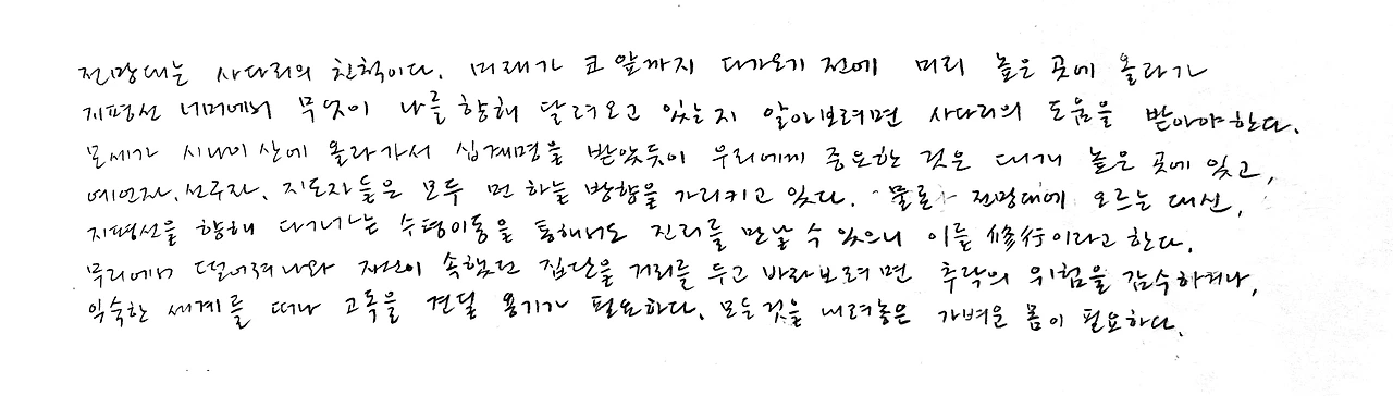 " 살면서 만나는 많은 사람들, 그리고 맞닥뜨려지는 여러 가지 일들이 항상 기쁜 일만 있을 수도 없고 또 슬픈 일만 있는 것도 아니죠. 그런 것에 일희일비하지 않고 항상 마음의 자리를 딱 지키는 것. 누가 꼭 나를 봐 주기 위해서 하는, 나를 포장하기 위해서가 아닌 자칫 미련한 듯 보여도 돌덩이처럼 움직이지 않는 단단한 마음과 태도가 중요해요. 그렇게 되면 내가 가고자 하는 길에 남들이 감히 범접할 수 없는 순간이 와요"