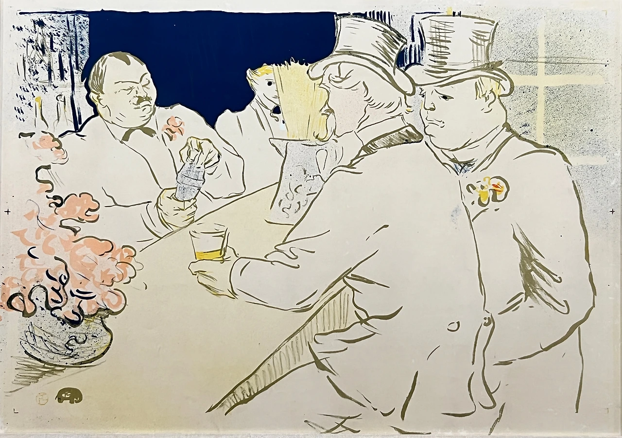 <물랑 루즈의 영국인 신사>는 몽마르트의 카바레 물랑 루즈에서 대화를 나누고 있는 남녀를 그린 석판화 작품이다. 콧수염을 기른 신사는 영국의 화가이자 로트렉의 절친한 친구였던 윌리엄 톰 워레너이다. 두 여성을 향해 쏠려 있는 남성의 자세와 게슴츠레한 눈매, 독특한 표정은 세 사람 사이 은밀한 대화가 오가고 있음을 짐작하게 한다.
