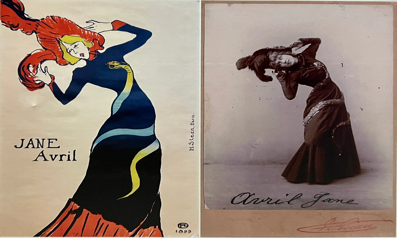 <제인 아브릴>은 로트렉이 신경쇠약과 알코올 중독으로 프랑스의 뇌이쉬르센에 있는 정신병원에서 지내는 동안 오랜 친구이자 뮤즈였던 제인 아브릴의 사진을 보며 그린 작품이다. 깃털이 달린 모자를 손으로 받치며 몸을 구부리는 아브릴의 모습은 마치 몸을 감고 올라오는 뱀 형상의 아플리케 장식을 보고 놀라 비명을 지르는 것처럼 보인다.